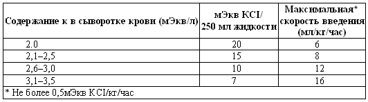 В идеале определяют электролитный состав крови и в случае гипокалиемии в капельницу добавляют соли калия. Объем и скорость введения после первого часа устанавливают на основе концентрации ионов калия в сыворотке крови. Соответствующие данные приведены в табл. 15.1.
