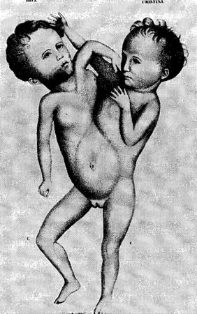 В томе гравюр, сопровождающем отчет об их анатомировании, Рита и Кристина Пароди выглядят парочкой небольших, изящных и довольно-таки хорошеньких девочек. У обеих черные глаза, а шелковистые кудряшки зачесаны вперед на лоб, по моде Французской империи, заставляя вспомнить парадный портрет Наполеона Бонапарта. У них прямые бровки и носики, рты приятно очерчены, а ручонками они тянутся друг к другу, как будто пытаясь обняться. Однако лица у них, в стиле того времени, строгие. Разделенные на уровне плеч и выше, туловищами они срослись. Ниже общего пупка это соединение достигает такой полноты, что на двоих у них имеются одни половые органы, один таз и одна пара ног. Это пример парадоксальной геометрии, так как, хотя каждая из девочек по отдельности столь сильно изуродована, взятые вместе они симметричны и пропорциональны; их телесная конструкция кажется в меньшей степени аномалией природы, чем достижением желаемого результата. Можно даже подумать, что видимая красота есть лишь следствие искусства гравера, но сделанная с их тела гипсовая отливка являет ту же гармонию форм. Если гравер в чем-то и ошибся, так это в пропорциях тела: они соответствовали бы детям более старшего возраста. Рите и Кристине к моменту смерти было всего восемь месяцев.
