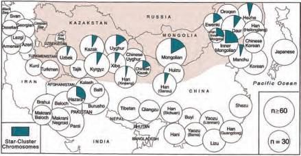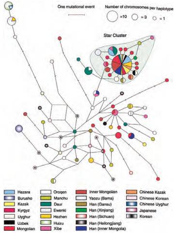 По поводу ответа на второй вопрос после проведенных нами исследований возникло, однако, большое сомнение. Поскольку не доказано, что обсуждаемый здесь вариант Y-хромосомы отличает именно потомков Чингиз-хана, я не буду называть его чингизидовым, а в дальнейшем буду использовать название «хромосомы звездного кластера». Речь идет ют о чем.