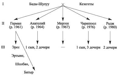Главное же то, что удалось выяснить происхождение семьи: корень ее ушел в Монголию. Отец Германа и Раджа, Бады-Шулуу, родился в 1930-ые годы в Монголии, с братом и сестрой был привезен в соседнюю Туву и здесь усыновлен, получил фамилию Д-т. Известно, что в 1930-ые годы в Монголии, следовавшей во всем за СССР, происходили жестокие репрессии. Можно полагать, что маленьких детей переправили в соседнюю страну тогда, когда родителям угрожала серьезная опасность. Корень рода оказался в Монголии, но происхождение его осталось неизвестным.