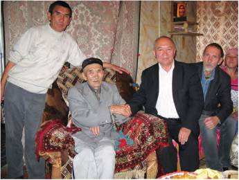 Мы встретились с 84-летним Кумаром (старик едва держался на ногах, его под руки привели и посадили в кресло) и его сыном Бектаем, дядей Серикбола (рис. 12). Отец Серикбола умер; Серикбола в то время, когда мы приехали, не было в Кош-Агаче. В доме собрались многочисленные родственники — женщины, подростки. На стол выставили тазы с кусками баранины и головой барашка, другие угощения. За едой мы услышали историю Кусмана, племянника Мамырбека. Кусман был богатый человек, в окрестностях Ташанты (это поселок на границе с Монголией) он имел 200 лошадей, 500 овец. В 1929 году, когда началось раскулачивание, он бежал в Китай, закопав золото и бросив скот. Ему удалось обмануть НКВД — он оставил гореть в юрте кизяк, чтобы шел дым, оставил пастись овец, а сам с табуном бежал. Но не к границе, а в сторону Джазатора, некоторое время там скрывался. Дождался, когда его перестанут искать, и только тогда перемахнул через границу. Он дожил до 96 лет; кое-кто из родственников встречался с этим стариком в Китае.