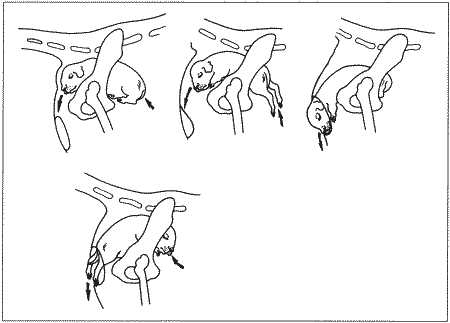 Оценка положения плода у суки на втором этапе родов. По: Shill (1983)