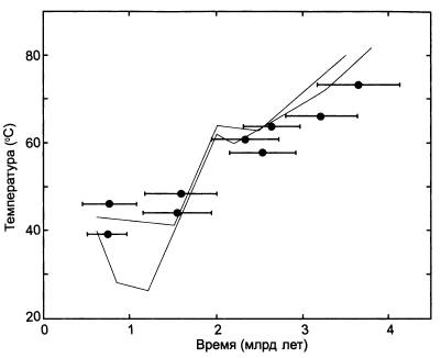 (Источник: Eric A. Gaucher, Sridhar Govindarajan, Omjoy K. Ganesh. Palaeotemperature trend for Precambrian life inferred from resurrected proteins // Nature. 2008. V. 451. P. 704–707.)