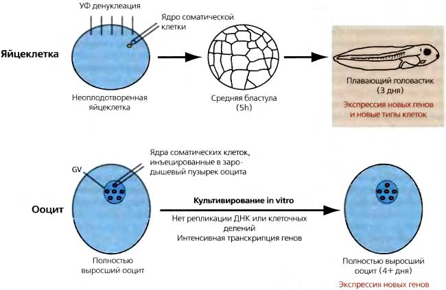 Верхняя часть рисунка иллюстрирует пересадки одиночных ядер в яйцеклетки, денуклеированные ультрафиолетовым облучением (УФ). Спустя три дня после пересадки ядра формируется плавающий головастик Нижняя часть рисунка показывает множественные пересадки ядер в растущие ооциты на стадии первой мейотической профазы (GV) Зародышевый пузырек, или ядро ооцита. Подвергшиеся инъекции ооциты не делятся и могут культивироваться в течение многих дней. Инъецированные ядра соматических клеток претерпевают изменения в экспрессии генов на протяжении первых четырех дней культивирования