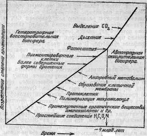 Изучение разреза горных пород в районе Исуа позволяет считать, что фотоавтотрофная биосфера существовала на нашей планете не менее 4 млрд лет назад. Однако, но всем данным цитологии и молекулярной биологии, фотоавтотрофные организмы были вторичными в процессе эволюции живого вещества. На рис. 7 показаны основные ступени эволюции вещества (образование первых клеток, а затем и фотосинтезирующих организмов). Автотрофному способу питания живых организмов должен был предшествовать гетеротрофный, как более простой. Автотрофные организмы, строящие свое тело за счет неорганических минеральных веществ, имеют более позднее происхождение. Еще видный советский биолог А. А. Заварзин (1886—1945) отмечал, что сравнительное изучение энергетических процессов в современных организмах позволяет заключить, что окислительные процессы (дыхание) имеют вторичное происхождение. Первыми процессами, освобождающими энергию в первоначальном живом веществе, были процессы, связанные с молекулярными перестройками, аналогичные процессам брожения. Отсюда следует, что вначале должны были возникнуть организмы гетеротрофные с интрамолекулярным дыханием, не требовавшим свободного кислорода. По всей вероятности, только после сложной эволюции определенной длительности появились автотрофные существа, использующие солнечную радиацию для усвоения СО2 и Н2О.
