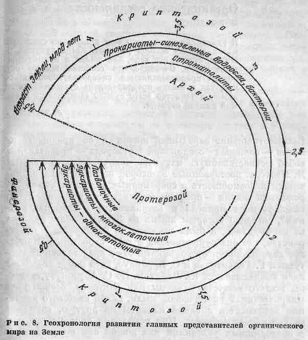 Длительность эволюции крупнейших групп организмов представлена на рис. 8. По мнению советского микробиолога Г. А. Заварзина [1984], данные а времени появления древнейших прокариот позволяют считать, что жизнь возникла не в земных пределах, а в космосе. Таким образом, на современном этапе наших знаний выясняется, что проблема происхождения жизни становится также проблемой космохимической, а не только биологической и биохимической.