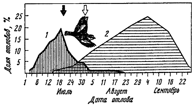 Рис. 28. Сроки отлета местных мухоловок-пеструшек (1) и пролета мигрирующих птиц (2) на Куршской косе.