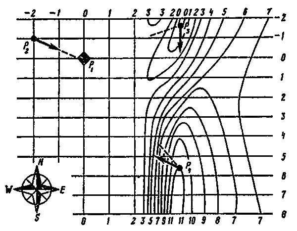 Как же находят птицы свой дом в незнакомой им местности? Согласно последним исследованиям многие ученые приходят к выводу, что птицы, вероятно, используют особую «навигационную карту», основанную по крайней мере на двух геофизических параметрах (полях), которые при наложении создают некую градиентную сетку, которая позволяет смещенной птице установить с помощью количественных измерений и сравнения их свое местоположение относительно дома (рис. 29). В отличие от «мозаичной карты» такая «градиентная карта» должна охватывать большие расстояния, в сотни и даже тысячи километров. Предполагается, что птицы знают направления градиентов относительно стран света. После выпуска в незнакомом им районе они, вероятно, измеряют локальное значение одного из градиентов и сравнивают его со значением, которое они запомнили в месте, где находится их дом. Например, если оно имеет меньшее значение (п. 1 на рис. 29), птица «решает», что она находится западнее своего дома и надо лететь к востоку. Измерение другого градиента дает второе направление; в результате сложения этих двух измерений птица берет верное направление на дом. Если птица попадает в район, где один из градиентов имеет аномальное изменение (например, и районе магнитных аномалий), птица будет ошибаться в выборе правильного направления на дом. Действительно, проверка способности почтовых голубей к хомингу в районах магнитных аномалий показала, что птицы выбирают неправильное направление (см. рис. 29). Возникает вопрос, как птицы научаются пользоваться такой «градиентной картой».