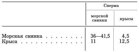 Сперматозоиды, попадая в половой тракт самки чужого вида, оказываются вообще говоря в обстановке, для них. необычной. Каждый вид животных помимо морфологических особенностей имеет конечно и свою собственную физико-химическую характеристику. Указания на это мы получаем хотя бы при сравнительном изучении осмотического давления спермы разных видов животных. Следующие таблицы показывают степень этого различия как в абсолютных величинах, так и в процентах, если взять за 100 сперму человека с наименьшим осмотическим давлением из числа видов, приведенных в таблице.