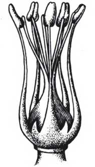 Цветок льна (без околоцветника): пыльники тычинок прикасаются к рыльцам пестика — самоопыление!