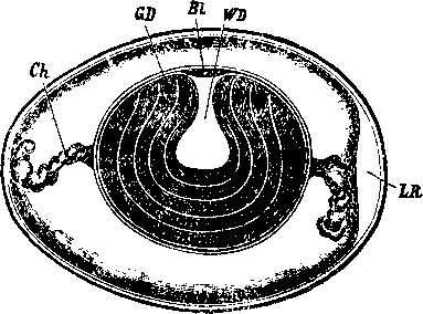 Разрез яйца курицы. В1 — образовательный желток, из которого развивается зародыш. WD — светлый питательный желток. GD — темный питательный желток. СА — градинки. LR — воздушная камера.