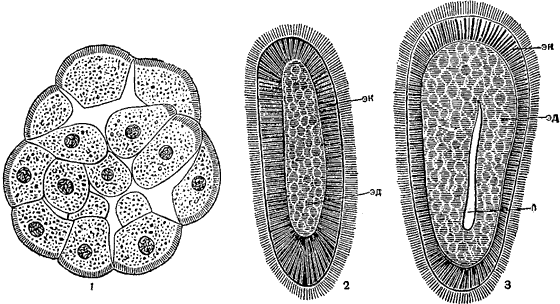 1 — образование энтодермы путем мультиполярной иммиграции (у медузы Aeginopsis); 2 — молодая личинка-паренхимула гидроидного полипа кампанулярии (Campanularia); 3 — более взрослая паренхимула с образующейся путем расщепления энтодермы полостью.