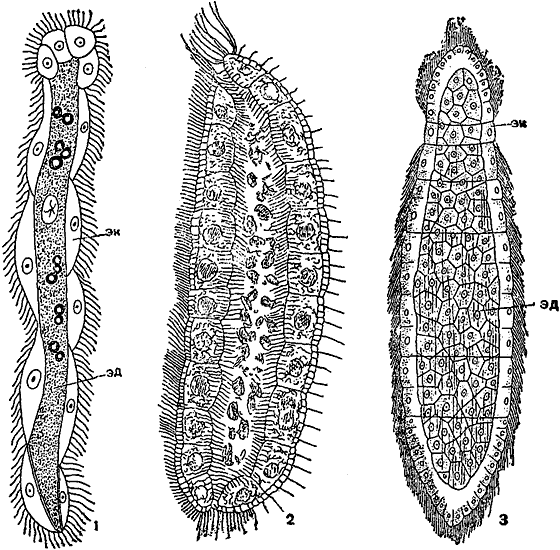 1 — дициема (Dicyema typus) с длинной срединной клеткой энтодермы; 2 — салинелла (Salinella salve); 3 — ропалюра (Rhopalura giardi) с плотной массой клеток энтодермы. Сильно увеличены, эд — энтодерма, эк — эктодерма.