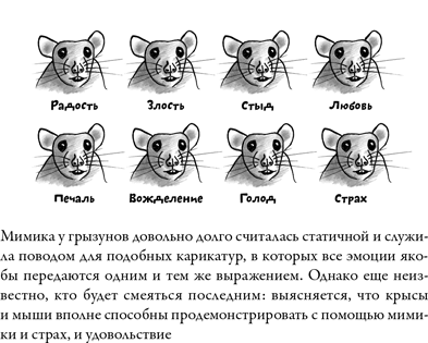 Очень долго считалось, что грызуны лишены эмоциональной мимики, однако тщательные исследования показали, что, испытывая боль или мучения, грызун сужает глаза, раздувает щеки и прижимает уши к голове. Другие грызуны распознают это выражение с легкостью – как видно из экспериментов, в ходе которых они предпочитали усаживаться рядом с фотографией, запечатлевшей расслабленную крысиную мордочку, а не искаженную болью. Мимика крысы способна сообщить и о приятных ощущениях. Когда швейцарские ученые разработали программу положительного воздействия, обеспечивающую лабораторным крысам ежедневное поглаживание и игры, в спокойные моменты после каждого такого сеанса исследователи наблюдали за выражением крысиных мордочек. Крысы, получившие положительное воздействие, заметно выделялись на общем фоне – более розовыми и менее напряженными ушами. Эти исследования покончили с устоявшимся мнением о статичности мимики у грызунов (отраженным в шуточных рисунках, где разные эмоции иллюстрировало одно и то же непроницаемое выражение)[29].