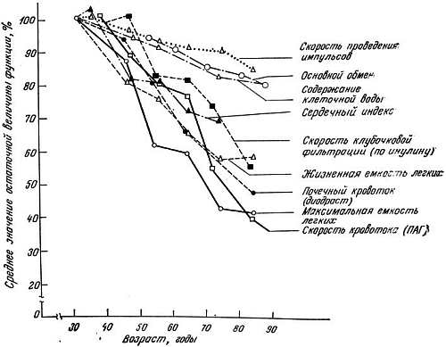 Длительные исследования изменений различных функций у одних и тех же добровольцев показали, что с возрастом различные функции нарушаются с разной скоростью (рис. 1.1). Эти исследования были начаты, когда добровольцам-мужчинам было 30 лет, причем неизвестно, имелись ли уже нарушения функций, изменения которых были обнаружены в 30 лет, в более раннем возрасте. Поскольку измеряли физиологические функции, их изменения, очевидно, отражают большие сдвиги в активности клеток и органов. Возможно, что молекулярные изменения, которые приводят к этим физиологическим изменениям, и изменения в общем функционировании всего организма человека происходят еще раньше, но это нельзя с определенностью утверждать, если не применяются высокочувствительные методы исследования.