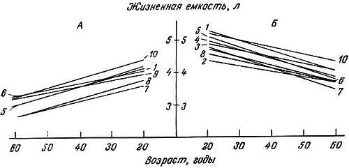 Рис. 1.2. Уменьшение с возрастом жизненной емкости легких у женщин (А) и у мужчин (Б) [5]