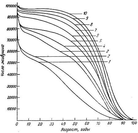 Рис. 1.3. Ожидаемая продолжительность жизни в разных странах — число доживающих (ось ординат) до определенного возраста (ось абсцисс) на 100000 мужчин [1, 3]: