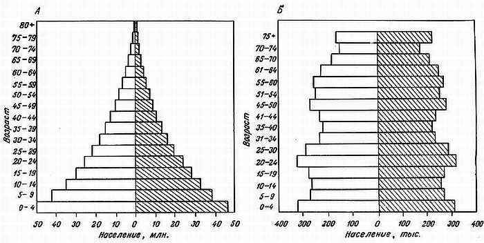 Рис. 1.5. Возрастная структура населения в Индии (А) и Швеции (Б) [4]