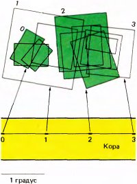 Учитывая сказанное выше, как можно объяснить анатомическую однородность коры? Для этого придется подробнее рассмотреть, что? происходит с положением рецептивных полей нейронов, встречающихся на пути продвижения электрода. Если мы будем вводить электрод в стриарную кору точно под прямым углом к ее поверхности, то окажется, что все эти рецептивные поля расположены почти в одном и том же участке поля зрения, но не совпадают полностью — от клетки к клетке положение рецептивного поля несколько меняется. Однако эти изменения кажутся случайными и не очень велики, так что рецептивные поля каждых двух последовательных клеток значительно перекрываются (этот факт отражен на рис. 91). В каждом данном слое коры размеры рецептивных полей относительно постоянны, однако при переходе к другому слою они заметно меняются — от очень малых в слое 4C до больших в слоях 5 и 6. В пределах одного слоя коры площадь, занимаемая десятью или двенадцатью последовательно зарегистрированными полями, из-за случайного разброса будет примерно в 2–4 раза больше, чем площадь рецептивного поля одной клетки. Назовем ту область, которую занимает вся совокупность рецептивных полей отдельных клеток в одном слое и в одной точке коры составным рецептивным полем данной точки. В зависимости от слоя коры величина составного поля варьирует — например, в слое 3 она равна около 30 угловых минут для центральной ямки и примерно 7–8° для дальней периферии.