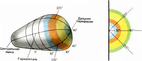 Рис. 96. Расправленная стриарная кора по форме напоминала бы грушу. Она имела бы вид четверти сферы, если бы все части сетчатки были представлены в ней пропорционально. На самом деле, однако, форма коры значительно искажена из-за несоразмерно увеличенного отображения центральной области сетчатки. Дальняя периферия (примерно в 90° от центра) отображена так слабо, что полукруг, соответствующий 90° (крайний справа), оказывается очень небольшим.