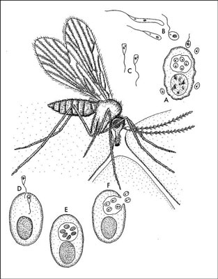 Рисунок 24. Меловой москит255, переносящий паразитов-трипаносом254, кормится на незащищённом участке кожи между чешуями динозавра. Вверху справа – стадии жизненного цикла паразита, протекающие в пищевом тракте москита: A. Заражённая клетка крови динозавра с мелкими сферическими амастиготами Paleoleishmania в кишечнике москита. Отдельные амастиготы могут также находиться в высосанной крови. B. Амастиготы превращаются в удлинённые, снабжённые жгутиками промастиготы, которые размножаются простым делением (бесполым путём). C. Образуются укороченные парамастиготы, с помощью которых происходит заражение динозавров. Внизу слева – стадии жизненного цикла паразита, протекающие в динозавре: D. Две парамастиготы проникают в кровяную клетку динозавра. E. Образование паразитифорной вакуоли, содержащей развивающиеся амастиготы. F. Клетка крови динозавра, выпускающая зрелые амастиготы. Цикл продолжается возвратом к стадии A. Тёмные овальные объекты в клетках крови – ядра. Изображено не в масштабе.