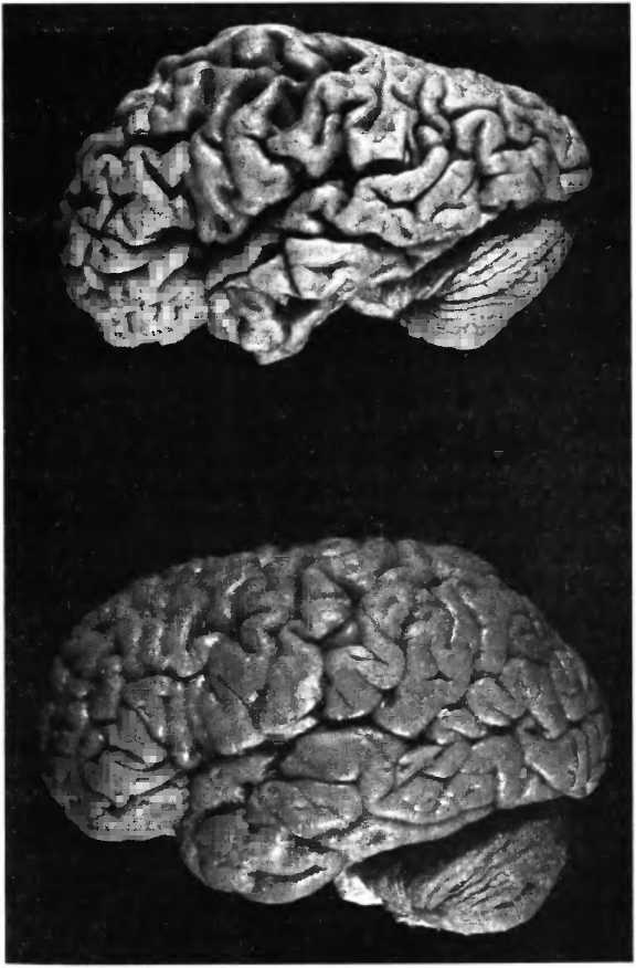 Рис. 31. При болезни Альцгеймера часто наблюдается сильное сморщивание (атрофия) мозга, он становится похож на грецкий орех. Внизу — здоровый мозг.