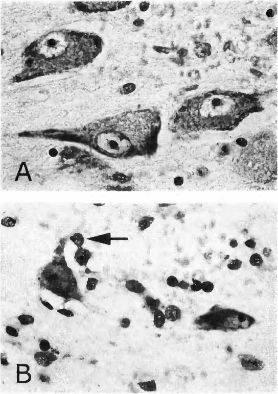 Рис. 32. Сморщивание (атрофия) мозга в базальном ядре Мейнерта при болезни Альцгеймера под микроскопом. А: большие нервные клетки (контрольный препарат, без болезни) направляют свои нервные волокна в кору больших полушарий, где они отдают нейротрансмиттер ацетилхолин (см. также рис. 24). В: эти клетки сморщены при болезни Альцгеймера. Стрелка указывает на три ярких примера сильно уменьшенных клеток, друг под другом.