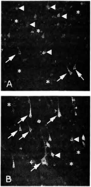 Рис. 33. Тонкие срезы ткани головною мозга скончавшегося пациента, полученные в течение десятичасового периода с момента смерти. В этом случае клетки мозга могут выращиваться в течение многих недель. Стволовые клетки, по-видимому, выделяют какое-то еще не известное вещество, которое повышает жизнеспособность нейронов в этой культуре. При стандартных условиях роста (А) через 48 дней было обнаружено всего несколько здоровых и активных клеток (стрелки) и гораздо больше клеток с неплотными мембранами (стреловидные треугольники). Их можно узнать по окрашенным ядрам. Кроме того, здесь много ядер мертвых клеток (маленькие шарики, обозначенные звездочками). На срезе (В) видно, что при культивировании такого же препарата мозговой ткани, но со стволовыми клетками того же пациента здесь гораздо больше здоровых активных мозговых клеток (стрелки) и меньше неплотных (стреловидные треугольники) и мертвых клеток.