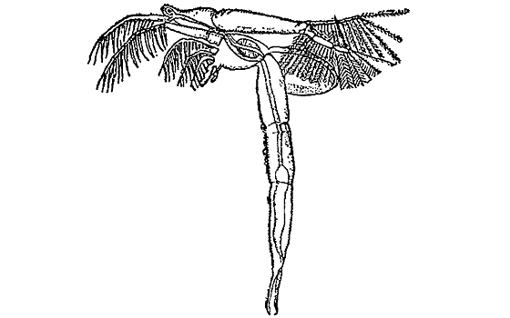 И по внешнему виду циклоп совсем не похож на дафнию. Грушевидное, сильно вытянутое назади тельце заканчивается двумя отростками, словно длинным хвостом. Длинные усики не двуветвистые, как у дафнии, и без длинных щетинок. Раковинки нет. На голове — непарный глаз.