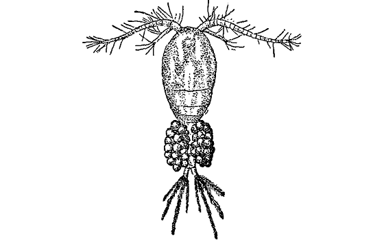 У части циклопов — у них всегда есть самцы и самки — видны по два комочка у основания брюшка: это самки, а комочки — мешки с яйцами. Самка носит яйца на себе, пока из них не вылупятся крохотные личинки. У личинки циклопа особое название — науплиус. Она мало похожа на взрослого циклопа: яйцевидная, всего с тремя парами конечностей.