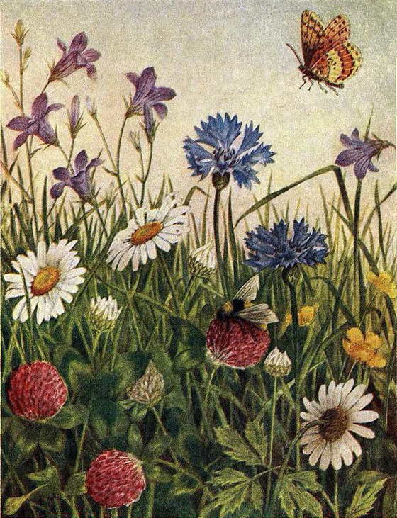 Первым открывает лепестки жёлтый козлобородник, похожий на одуванчик. Это бывает между тремя и пятью часами утра. За ним следом расправляет голубые звёздочки своих цветов цикорий, раскрывает широкие лепестки шиповник. Вспыхивают яркими огоньками цветы мака, которым нужно скорее опылить свои цветы: ведь каждый из них цветёт только два-три дня, а потом увядает.