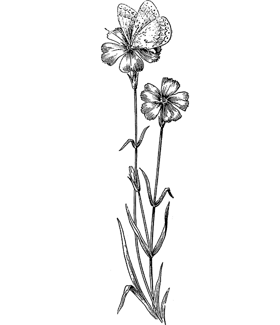 Вот, например, полевая гвоздика. Её малиновые лепестки, окрашенные в любимый цвет бабочек, и по форме приспособились только к их посещению. Пять широко раскрытых лепестков похожи на плоскую круглую площадку, очень удобную для посадки бабочек. Лепестки не мешают их большим крыльям.