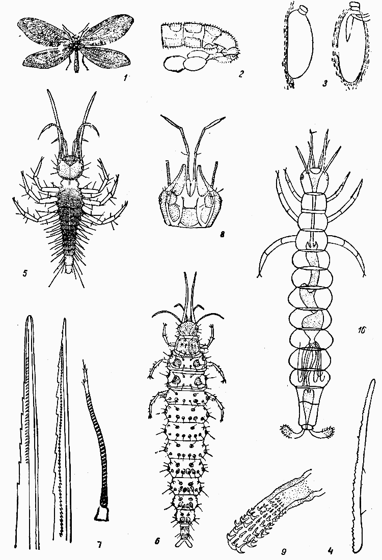Таблица XXXVIII. Осмилус - Osmylus chrysops: Рис. 1. Осмилус, imago. - Рис. 2. Конец брюшка самки со сперматофором. - Рис. 3. Яйцо осмилус. - Рис. 4. Разрыватель яйца. - Рис. 5. Личинка 1-й стадии. - Рис. 6. Личинка 3-й стадии. - Рис. 7. Антенны, концы жвал (слева) и максилл. - Рис. 8. Голова личинки перед окуклением вентрально. - Рис. 9. Анальные крючки личинки. - Рис.10. Схема пищеварительной системы.