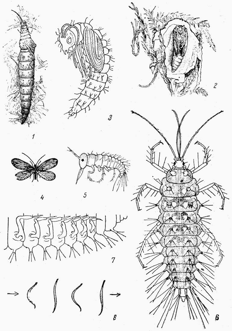 Таблица XXXIX. Рис. 1. Личинка осмитус в мае. - Рис. 2. Куколка осмилус в коконе. - Рис. 3. Куколка осмилус, схема. - Рис. 4. Сизира (imago). - Рис. 5. Личинка сизиры 1-й стадии. - Рис. 6. Личинка сизиры 3-й стадии. - Рис. 7. Жабры сизиры, Рис. 8. Схема плавательных движений личинки сизиры.