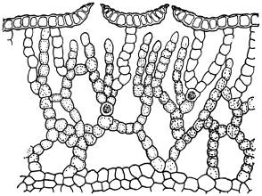 Рис. 1. Поперечный срез слоевища печеночника, относящегося к подклассу Маршанциевых, — Mannia brachypoda. Видны воздушные камеры, ассимиляционные нити (не достигающие верхнего слоя клеток клеточные ряды) и продушины в верхнем слое клеток слоевища. Пример довольно сложно устроенного слоевища.