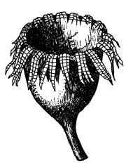 Для чего все это нужно, мы расскажем чуть позже. А пока перейдем к внутреннему перистому. О его строении легче всего получить представление, если взять бумажную ленту и по всей ее длине сделать узкотреугольные вырезы примерно на две трети ширины ленты. На ленте возникают зубчики. После этого ленту надо сложить «гармошкой» и соединить концы. Вот примерно так выглядит внутренний перистом, нечто вроде гофрированной короны. Это килевато-складчатая пластинка (она называется основной перепонкой), усаженная наверху отростками, имеющими более или менее ланцетную форму. Часто отростки имеют отверстия, расположенные вдоль средней линии. Между отростками нередко находятся реснички — тонюсенькие ниточки, обычно как бы с узелочками (небольшими утолщениями, похожими на узелочки) или же с особыми выростами, придающими ресничке перистый облик.