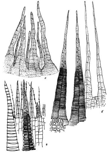 а — спирально завитой перистом Barbula fallax, представителя порядка Pottiales; б — нечленистый перистом представителя порядка Polytrichales, в — почти нитевидный членистый перистом Ptychomitrium longisetum.