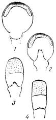 1 — вертикальный разрез через созревшую коробочку, вверху располагается колоколообразный споровый мешок, вся полость коробочки занята колонкой; 2 — дальнейшая стадия созревания: колонка усыхает и приобретает вид небольшого столбика в нижней части коробочки, бо?льшая часть полости коробочки заполнена воздухом; 3, 4 — созревшая коробочка превращается из шара в цилиндр, полость коробочки уменьшается, воздух в ней сжимается.
