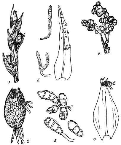 1 — выводковые почки, образующиеся в верхней части стебля; 2 — отпавшая выводковая почка; 3, 4 и 5 — выводковые тельца различной формы; 6 — ризоиды на верхушке листа.