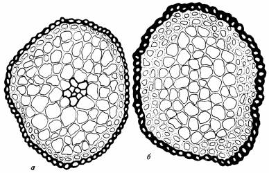 а — в центре стебля видны клетки центрального проводящего пучка, периферический ряд толстостенных клеток — наружная кора; б — центральный проводящий пучок отсутствует, внутреннее строение стебля довольно однообразно.