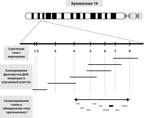 Рис. 33. Схема процедуры поиска гена-кандидата, ответственного за болезнь Альцгеймера. Фрагмент с геном пресенилина указан внизу темным цветом