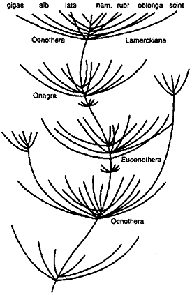 Этим де Фриз не ограничивается. Он добавляет, что рисунок можно было бы подобным же образом продолжить вниз — «вплоть до самых древних живых существ», и далее пишет: «На рисунке… мы восходим от видов к сборным видам (Oenothera lamarckiana), от сборных видов — к подродам (Onagra и Euoenothera), а отсюда — к родам (Oenothera). Более древним взрывам соответствовали бы подсемейства, семейства и все высшие системы. Если бы вся система была известна нам без пробелов и генеалогическое древо имело бы форму обыкновенной дихотомической таблицы для определения, то каждая точка разветвления означала бы для нас место взрыва…» (Фриз де, 1904. С 192).