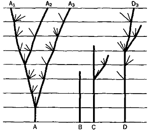 Де Фриз наглядно отобразил свою концепцию взрывного видообразования в виде схематичного родословного древа (рис. 3), внешне очень напоминающего хорошо знакомую аквариумистам водоросль кабомбу. Это длинная, местами ветвящаяся нить, образующая массу мутовок, находящихся на одинаковых расстояниях друг от друга. Каждая ветвь мутовки представляет собой вид или подвид, имеющий начало и конец, а каждое звено нити между соседними мутовками — неизменное состояние родоначального вида. Каждая мутовка соответствует мутационному периоду, все же древо в целом отображает род.