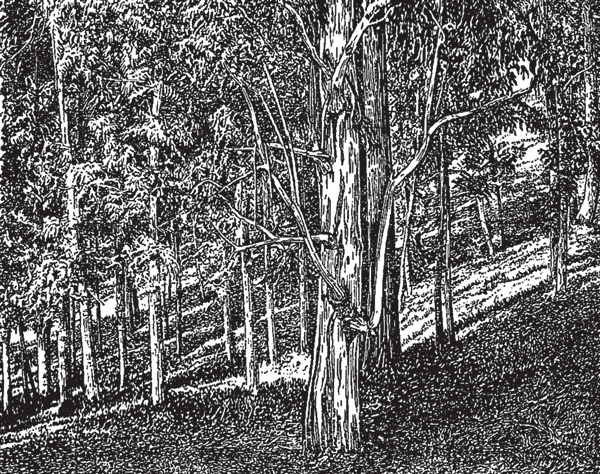 Если вы интересуетесь ботанической стороной вопроса, я могу сказать вам, что эвкалипты относятся к семейству Миртовых растений. Род эвкалиптов, как пишут в книгах, содержит около 600 различных видов. Все они — уроженцы Австралии и прилегающих к ней островов. Наиболее высокий эвкалипт, о котором мы упоминали, принадлежал к виду, который ботаники называют — эвкалипт миндалелистный (Eucalyptus amygdalina). Его и принято считать величайшим деревом в свете. Но, может быть, читатель, вас более интересуют не научно-ботанические, а технические вопросы. Тогда я могу рассказать вам, что эвкалипты одни из самых ценных даров флоры. Тяжелая, плотная древесина эвкалиптов отличается необыкновенной прочностью. В кораблестроении это — материал самой высокой ценности: для корабельных килей (конечно, небольших судов) и мачт нет лучшего материала. Сваи, телеграфные столбы, торцевые мостовые и т. п. из эвкалиптового дерева получаются самые долговечные. При полировке различные сорта эвкалиптов дают чрезвычайно красивый материал то серых, то коричневых, то темно-красных тонов; но столяры недолюбливают эвкалипт за его «железную» твердость. В Европе в большом ходу красивые эвкалиптовые фанеры, которыми часто оклеивают мебель. Если я добавлю, что эвкалипты дают массу ценного материала для дубильных веществ, лечебное эвкалиптовое масло, что некоторые эвкалипты дают каучук, я еще не перечислю всех технических заслуг эвкалиптов. Однако нам некогда останавливаться на этих вопросах: мы уже подошли к той рощице, к которой стремились.