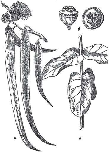 Рис. 5. Эвкалипт (Eucalyptus globulus): а — ветка с цветком и бутоном, закрытым деревянистой крышечкой; б — плод сбоку и сверху; в — листья молодого побега.