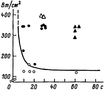 По оси абсцисс — время воздействия, с, по оси ординат — интенсивность ультразвука в фокальной области (осреднена по площади фокальной области), Вт/см2. Светлые кружки — отсутствие видимых морфологических изменений при световой микроскопии, черные — локальные изменения в центре фокальной области, черные треугольники — очаги изменений без четких границ с расширением сосудов и кровоизлияниями, светлые — обширные диффузные изменения с кровоизлияниями и разрывами тканей. Частота фокусированного ультразвука 2.34 МГц.
