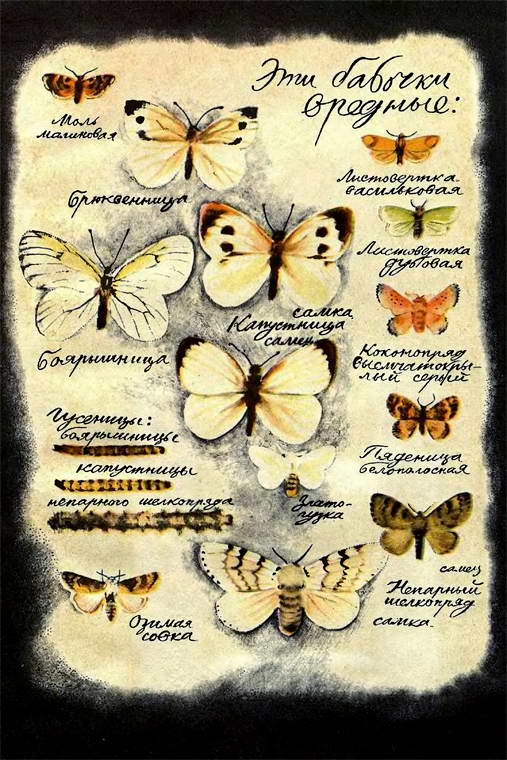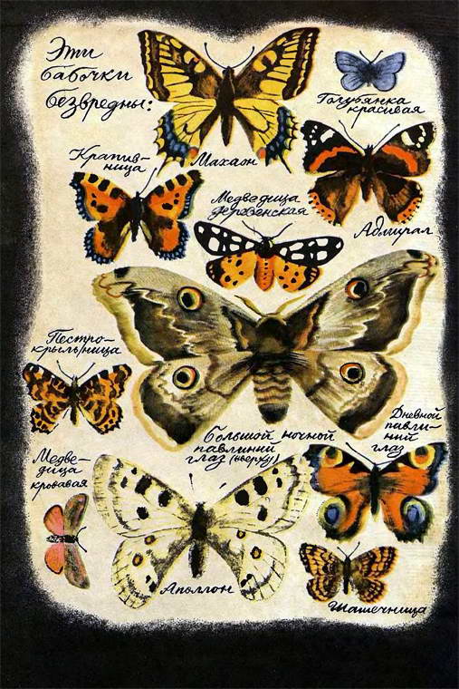 Вообще-то он вовсе не мой, но я ничего не стал говорить — какая разница? И дело ведь тут не в одном Мишке Крышкине. На коллекцию полезных и вредных бабочек интересно посмотреть многим ребятам. Но так как все ребята не могут прийти и посмотреть коллекцию моего нового знакомого, я попросил нарисовать ее для вас.