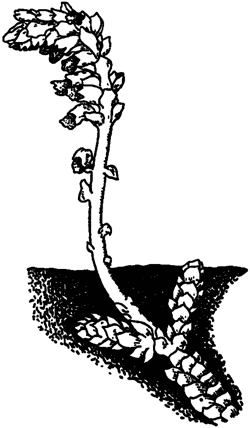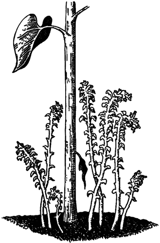 Скажем здесь несколько слов о заразихах: это пригодится нам при одном из дальнейших рассказов. Заразиха представлена несколькими видами: один живет на подсолнухах, другой — на конопле, третий — на полыни, четвертый — на чертополохе и т. д. Все заразихи — паразиты. Они не умеют добывать себе пишу сами, они могут питаться только чужими соками. Это сразу заметно по внешнему виду всех подобных паразитов: у них нет зеленых листьев, вместо них имеются только бесцветные чешуйки. Корни заразихи присасываются к корням зеленых растений и перехватывают пищу, добытую чужими листьями.