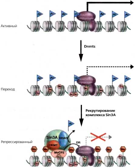 Эта переходная фаза представляет собой промежуточный этап, во время которого транскрипция сайленсирована и происходит метилирование ДНК. Предполагается, что МеСР2 рекрутирует комплекс деацетилазы гистонов (HDAC) Sin3A и активность метилтрансферазы лизинов гистонов (НКМТ) к метилированным сайтам. Кроме того, имеются некоторые данные о том, что МеСР2 может прямо репрессировать транскрипцию путем контакта с комплексом инициации транскрипции (DR). Другие связывающиеся с метил-CpG белки взаимодействуют с разными корепрессорами, включающими активность НКМТ и (или) HDAC, и потенциально рекрутируют их