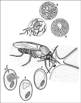 Рисунок 23. Меловой мокрец (Protoculicoides sp.), переносящий малярийного паразита (Paleohaemoproteus burmacis)167, кормится на незащищённой коже между чешуями динозавра. Вверху – стадии жизненного цикла паразита, которые протекают в теле мокреца: A. Шарообразные тела, предназначенные для превращения в спорозоитов, развивающихся в ооцисте, прикреплённой к стенке кишки. B. Незрелые спорозоиты, развивающиеся в ооцисте. C. Зрелые удлинённые спорозоиты покидают ооцисту и мигрируют по телу переносчика болезни к слюнным железам. Внизу – стадии паразита, которые происходят в теле динозавра: D. Удлинённые спорозоиты проникают в клетки внутренних органов и превращаются в мелкие сферические бесполые образования, называемые мерозоитами. E. Один мерозоит проникает в кровяную клетку, а другой уже начал превращение в гаметоцист. F. Зрелый гаметоцист почти целиком заполняет кровяную клетку. Это стадия, которую получает мокрец при питании. Половое размножение паразита происходит в кишке насекомого, и продукт слияния (оокинета) внедряется в стенку кишки и развивается в ооцист. Жизненный цикл паразита продолжается возвращением к стадии A. Тёмные овальные объекты в клетках позвоночного – ядра. Изображено не в масштабе.